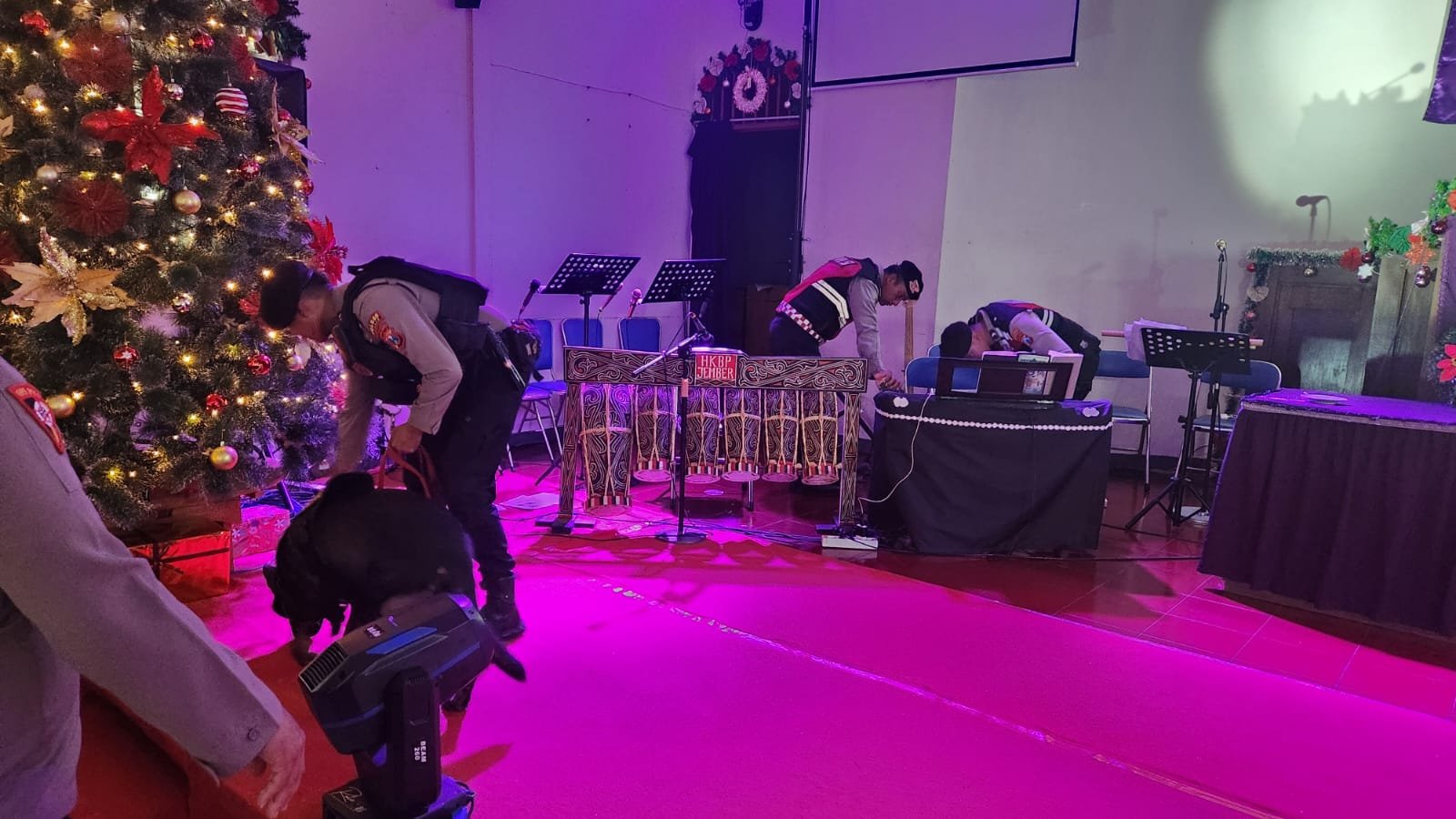 Kegiatan sterilisasi ini dilakukan untuk memastikan tidak adanya benda mencurigakan maupun potensi ancaman yang dapat mengganggu jalannya ibadah Natal. Pemeriksaan dilakukan secara menyeluruh di area dalam dan sekitar gereja, termasuk ruang ibadah, altar, hingga akses pintu masuk.